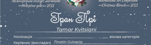 ჩვენი სასწავლებლის მოსწავლემ, თამარ კვიციანმა (9 წ. პედაგოგი-თინა ღვინერია), უკრაინაში გამართულ ონლაინ კონკურსში, "Новорiчна диво" ("New year miracle"), ნომინაციაში „ინსტრუმენტალისტები“, გრან პრი მოიპოვა.